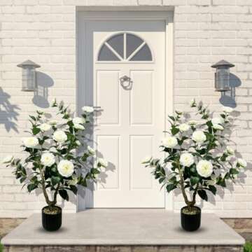 Show more Introducing the stunning Realistic White Camellia Tree, the perfect addition to any home or outdoor space. This exquisite set includes two pieces of beautiful artificial white camellia trees that are crafted with the utmost attention to detail. Made from high-quality PE material, these trees are designed to not only look breathtakingly realistic but also to withstand the test of time. The clever designer's touch ensures that they bring a touch of elegance and serenity wherever they are placed.