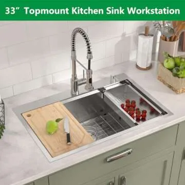 Show more Experience the ultimate blend of durability and elegance with the Talllor 33 Drop-In Kitchen Sink. Crafted from premium 16-gauge T304 stainless steel, this exceptional sink is engineered for superior strength and long-lasting performance. Its commercial-grade brushed finish offers unparalleled scratch resistance, ensuring it maintains its pristine appearance over time. The unique workstation design features a single tier integrated slide, allowing you to effortlessly use built-in accessories, optimizing your kitchen space.