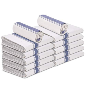 TALVANIA Kitchen Dish Towels - 100% Cotton, White Flour Sack with Blue Herringbone Stripe, Pack of 12 15” x 25”