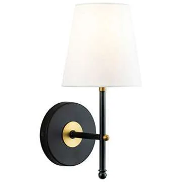 Show moreIntroducing the magnificent Tamb Wall Sconce with Fabric Shade, a stunning addition to any home decor. This exquisite wall sconce features an elegant antique brass finish that exudes sophistication, making it the perfect accent for your hallway, bathroom, bedroom, or living area. Measuring at 12.75 inches high and 5.75 inches wide, with an extension of 7.25 inches from the wall, this fixture is designed to make a statement while illuminating your space. The beautiful white fabric shade (measuring at 6 inches high and 6 inches in diameter) softens the light, creating a warm and inviting atmosphere in your home.