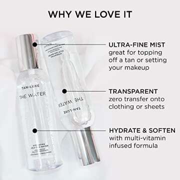 Show moreDiscover the beauty of radiant skin with TAN-LUXE The Water Mini, a hydrating self-tanning water designed for a flawless glow. At just 100ml, this cruelty and toxin-free formula is perfect for on-the-go use, offering a light to medium tan that adapts beautifully to all skin tones. The innovative water-like texture allows for a seamless application, effortlessly enhancing your natural beauty without any streaks or orange undertones. It’s infused with a blend of skincare ingredients, ensuring your skin remains hydrated, fresh, and glowing with each use.