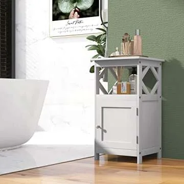 Show moreExperience a new level of organization and style in your home with the Tangkula Freestanding Bathroom Storage cabinet. This beautifully crafted cabinet not only serves as a practical storage solution for your bathroom essentials but also enhances the decor of your living space. Designed with utmost care and precision, it features a sleek single-door cabinet that provides ample space for toiletries, while the open compartment and large tabletop offer a perfect spot for displaying decorative items or keeping essentials at hand. Its overall dimensions of 15.5" x 15.5" x 29" make it a perfect fit for any narrow space, combining functionality with a modern aesthetic.