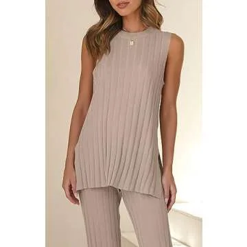 Tankaneo Two Pieces Outfits Sleeveless Top Knit Sets Trendy Lounge Long Pajamas Set Camel