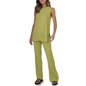 Tankaneo Two Pieces Outfits Sleeveless Top Knit Sets Trendy Lounge Long Pajamas Set Olive Green
