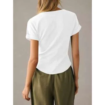 Show more Discover the elegance and comfort of the Tankaneo Women Deep V Neck Low Cut Tops, a perfect blend of style and functionality designed for your summer wardrobe. Crafted from a lightweight and stretchy ribbed knit material, this women's basic top offers unmatched soft, skin-friendly wear without the worry of being see-through. The delightful short cuffed sleeves and a dramatic deep v-neck create an alluring silhouette that flatters all body types, while the fitted and curved hemline adds a chic finish to your look. Ideal for both casual outings and stylish day events, this versatile tee is set to become your go-to favorite for the sunny season!
