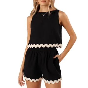 Show moreStep into summer elegance with the Tankaneo Women's 2 Piece Vacation Outfits Lounge Sets. This stylish and versatile casual ensemble features soft, breathable cotton fabric to keep you comfortable and chic even on the hottest days. Tailored for effortless dressing, it allows you to transition seamlessly from a relaxed day at home to an outing with friends. The set includes a trendy sleeveless tank top with a ric rac hem combined with matching high-waisted shorts that boast a chic color block design. Get ready to embrace that summer vibe in style!