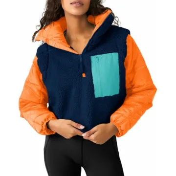 Tankaneo Womens Fleece Puffer Pullover Jacket Sherpa Fuzzy Coat Fall Winter Half Zip Color Block Sweatshirt Navy