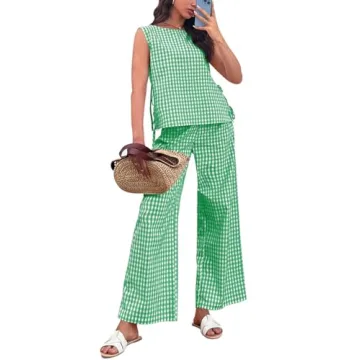 Show moreEmbrace the summer with the Tankaneo Women's Summer 2 Piece Set, designed for ultimate comfort and style. Made from 100% cotton, this set offers a lightweight, soft, and breathable texture, ensuring a comfortable wearing experience even on the hottest days. The package includes a stylish gingham tank top with a back keyhole closure and wide leg pants, both featuring a vintage plaid checked pattern. The tank top's crewneck, sleeveless, and tie-up side design keeps you cool, while the wide leg pants with a back elastic waist and hidden zipper flatter your figure, making you look tall and slim.