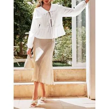 Tankaneo Womens Tie Front Tops Casual Babydoll Long Sleeve Blouses Peplum Cotton Bow Shirts White