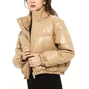 Tanming Womens Faux Leather Puffer Jacket Winter Long Sleeve Black Short Bubble Coat(Khaki-S)