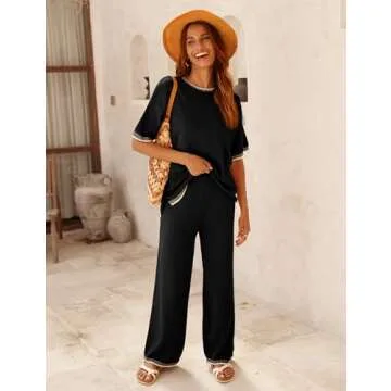 Tanming Womens Lounge Sets 2 Piece Outfits Short Sleeve Knitted Tops Wide Leg Pants Sweater Sets(Black-M)