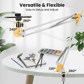 TARION Overhead Video Stand Desk Phone Mount Stand Articulating Arm Flexible Cell Phone Holder Arm for Overhead Video Filming Livestream Flat Photography Videography White