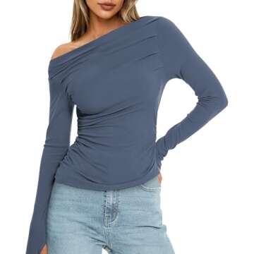 Introducing the TARSE Women's Casual Long Sleeve Off The Shoulder Top, the perfect blend of style, comfort, and versatility. Crafted from lightweight ribbed knit fabric, this top is designed to hug your curves while providing enough stretch for ultimate comfort and movement. It features an asymmetrical boat neck that allows you to wear it off one shoulder or even as a chic boat neck style. The ruched sides add a touch of femininity and flair...