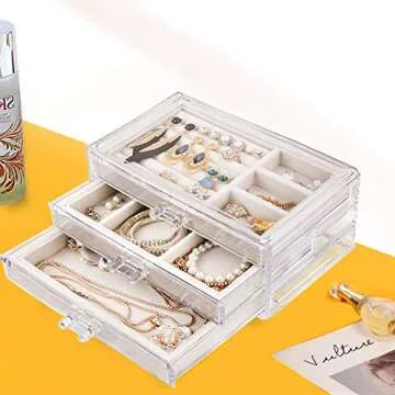 Show more Discover the perfect blend of elegance, functionality, and versatility with the Tasybox Clear Jewelry Box Organizer. This beautifully designed jewelry box features a durable acrylic exterior complemented by a plush velvet-lined interior, ensuring your cherished pieces are always safeguarded against damage and scratches. Its sleek beige finish adds a touch of sophistication to any dresser or vanity, making it not just a storage item but an elegant display piece. Measuring 9.25 inches long, 5.31 inches wide, and 4.72 inches high, this jewelry organizer is compact enough to fit seamlessly into any space.