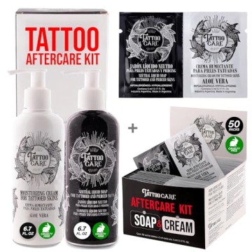 Show moreIntroducing a revolutionary tattoo aftercare solution designed for tattoo enthusiasts and professionals alike. This product provides unparalleled healing benefits with a gentle and soothing cream, complemented by a nourishing soap that collectively moisturize and rejuvenate your skin. Suitable for all skin types, our formula promotes faster healing, allowing you to enjoy your new ink without the worry of irritation or discomfort. The brand is well-respected in tattoo studios across the country, known for its premium quality and trusted efficacy. With large home-sized bottles, you can enjoy ample supply for weeks to come, ensuring that your tattoos are cared for without constant repurchase. For those who are always on the move, the product offers convenient travel-friendly pillow packs. These mini-packages are perfect for carrying along while traveling, guaranteeing that you maintain the optimal aftercare your tattoos need, even when you’re away from home.