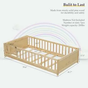 Tatub Twin Floor Bed for Kids with Slats, Solid Wood Montessori Bed with Built-in Book Storage Rack and Door, Nature