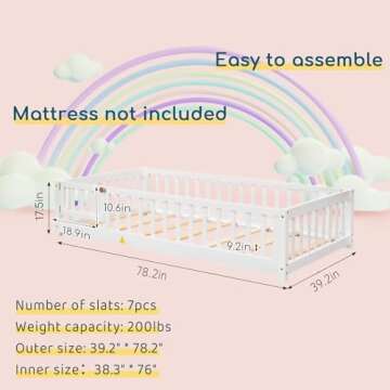 Show moreIntroducing the Tatub Twin Montessori Bed with Rails and Slats, the ultimate floor bed designed specifically for growing children. This versatile furniture piece doubles as a cozy sleeping space, a vibrant play area, and a comfortable reading nook, allowing your child's imagination to soar. Available in a clean and modern white finish, the bed seamlessly fits into any nursery or bedroom aesthetic. Crafted from premium wood, the bed features a low-profile design that promotes safety and encourages children to transition from co-sleeping to their own independent sleeping space.