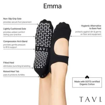 Show moreIntroducing the Tavi Noir Emma Grip Socks - the perfect fusion of style, comfort, and functionality designed specifically for the modern fitness enthusiast. With a chic Mary Jane style, these socks feature a low profile that provides a snug fit just below the ankle, allowing for unrestricted movement while ensuring you look fabulous in the studio.