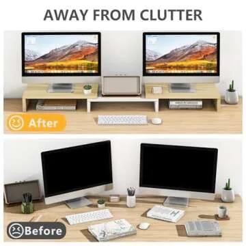 Elevate your workspace with the TAVR Dual Monitor Stand Riser, a stylish and multifunctional solution designed to maximize your productivity and comfort. This versatile desk organizer adapts easily to your needs, accommodating up to two or three monitors while seamlessly integrating into any home or office environment. Crafted with a modern oak and white wood finish, this monitor riser not only provides an ergonomic boost by raising your screens to eye level, reducing the strain on your neck...