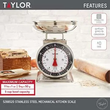 Show more Introducing the **Taylor Mechanical Kitchen Weighing Food Scale with Bowl**, the ultimate solution for home cooks and health enthusiasts alike. With a legacy spanning over **150 years**, Taylor has established itself as a trusted name in kitchen measurement, providing precision tools that remove the guesswork from cooking. This scale boasts a high-quality construction that can measure weights up to **11 pounds (5 kilograms)** in increments of **1 ounce and 50 grams**. Whether you're portioning out ingredients for a healthy recipe or weighing out groceries, this scale ensures that you achieve impeccable accuracy every time.