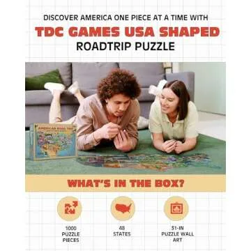 Show more Immerse yourself in the stunning landscape of the United States with our unique 1000-piece jigsaw puzzle. This beautifully crafted puzzle allows you to explore all 48 states, featuring iconic landmarks and vibrant fonts that make each piece stand out. Crafted by the renowned brand TDC Games, it has been designed to transform your living space into a work of art that reflects your love for travel and geography. The completed puzzle measures an impressive 31 inches, making it an eye-catching centerpiece in any room.