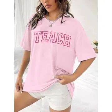Teach Shirt Oversized for Women Teacher Letter Printed T-Shirt Casual Embroidery Teacher Life Short Sleeve Tee Tops Pink