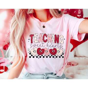 Teacher Valentines Shirt for Womens Teaching Sweethearts T-Shirt Short Sleeve Candy Heart Tee Tops Light Pink