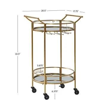 Show moreIntroducing the elegant and sophisticated Teagan Gold Metal Round Mobile Bar Cart with Mirrored Shelves by Linon—your ultimate companion for stylish entertaining. Perfectly crafted for both utility and aesthetics, this bar cart elevates any space with its stunning gold leaf finish and contemporary design. It boasts two spacious shelves: the top shelf features three finely crafted wine glass holders to keep your favorite glasses at hand, while the bottom shelf showcases three dedicated wine bottle holders, designed to hold standard bottles with ease. This versatile design allows you to display your collection with flair, creating a focal point at your gatherings.