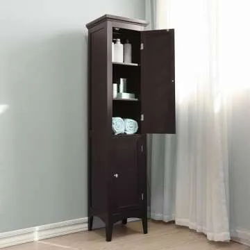 Show moreIntroducing the Teamson Home Glancy 63 in. Freestanding Linen Storage Tower – your ultimate solution for transforming cluttered spaces into organized havens. Perfectly designed for areas like bathrooms, kitchens, and living rooms, this stylish storage tower is crafted from sustainable engineered wood, ensuring durability and environmental friendliness. Say goodbye to messy bathrooms and hello to streamlined storage, with enough room to accommodate clean towels, linens, pillows, and a variety of household supplies. Elegant and functional, the rich dark brown finish seamlessly blends with any decor, making it a fantastic addition to your home.