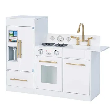 Show moreStep into the world of imaginative play with the Teamson Kids Little Chef Charlotte Modern Modular Interactive Wooden Play Kitchen. This exquisite play kitchen combines contemporary design with interactive features to spark creativity in young chefs. Crafted in a sleek white finish with elegant gold hardware, it includes a refrigerator, stove, and sink, offering a realistic cooking experience. The refrigerator comes with a built-in icemaker and play ice cubes, while the oven features clicking and turning knobs for added fun. With ample storage space for play food, dishes, and cleaning supplies, this kitchen is as practical as it is beautiful. The modular design allows the refrigerator to separate from the oven/sink combo, offering flexibility in playroom layout. Made of durable engineered wood, this play kitchen is built to last and easy to clean, making it a safe and stylish choice for children aged 3 and up.