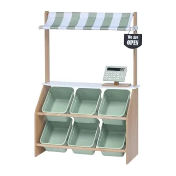 This impressive market stand features 6 bright green plastic storage bins that allow little ones to organize their pretend fruits and vegetables, teaching essential organizational skills while fostering creativity. To enhance the realism of their play, it comes equipped with a charming "We Are OPEN/CLOSED" sign and a foldable awning, immersing kids in the role of shopkeepers. The included wooden cash register tablet invites interactive role-play, helping develop crucial social skills and teamwork among friends and family members.