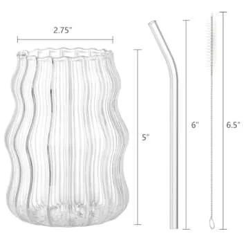 Show more If you're searching for a blend of elegance, functionality, and sustainability, look no further than the Tebery 4 Pack Ribbed Aesthetic Glass Cups. Measuring 16oz, this exquisite set of drinking glasses is not just a treat for the eyes but also perfect for numerous beverages—from refreshing iced coffee to delightful cocktails. These beautifully crafted glasses come with four reusable glass straws and two cleaning brushes, ensuring a complete, eco-friendly drinking experience. Constructed from premium, non-toxic glass, they are completely BPA-free, promising that your drinks taste pure and untainted. The modern wave and tumbler striped design adds a fashionable twist to your table décor, making every sip feel special.