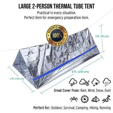 Show moreWhen unexpected weather hits during your outdoor adventures, the TEBRION Emergency 2-Adult Mylar Thermal Tent comes to the rescue! This versatile survival tent, measuring a generous 8 feet by 5 feet, is designed to accommodate up to two adults comfortably. Its lightweight and compact design makes it easy to pack, ensuring that you can take it wherever your adventures lead you. With an easy three-step setup process and included 20 ft. rope, preparing for harsh environmental conditions has never been simpler.