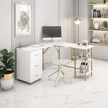 Techni Mobili L Shaped Desk - Two-Toned Computer Desk with Drawers & Storage Shelves - Simple Modern Furniture & Home Office Space Corner Table for Work & Writing