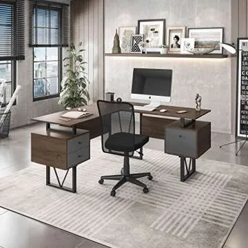Techni Mobili Reversible Modern Versatile L Shaped Drawers and File Cabinet Home Office Desk, 59" W x 57.3" D x 30" H, Brown, Grey