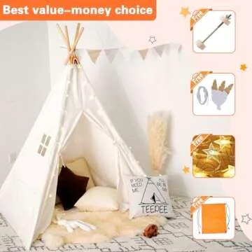 Teepee Tent for Kids Foldable Teepee Play Tent with Fairy Lights, Carry Case Water Resistance, Pretend Camp Fire, Four Poles Style Raw White Color - New Version Tiny House little dove