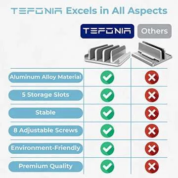 Show moreThe Tefonia 5-in-1 Vertical Laptop Stand is a revolutionary solution designed for tech enthusiasts and professionals who demand efficiency and elegance in their workspace. Crafted from premium brushed aluminum and CNC-machined to deliver exceptional durability, this laptop stand isn't just functional—it's a statement piece that complements any modern desk setup. Imagine getting rid of clutter while showcasing your favorite devices—this stand accommodates devices such as MacBook, Surface, Samsung, HP, Dell, Chromebooks, tablets, smartphones, and even gaming laptops seamlessly. With the ability to hold up to 5 devices simultaneously, you can save an impressive 5 sq. ft. of valuable desk space.