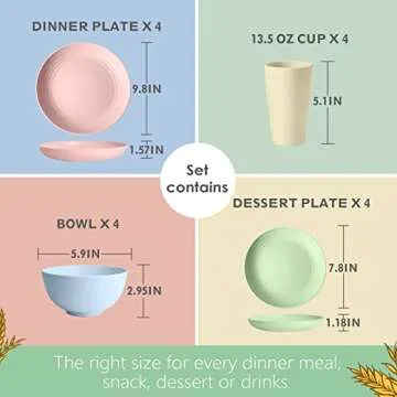 Show more Introducing the Teivio 16-Piece Kitchen Plastic Wheat Straw Dinnerware Set, a stylish and practical solution for all your dining needs. This set includes everything you need for a complete meal setting, designed for four individuals with dinner plates, dessert plates, bowls, and cups. Made from eco-friendly wheat straw material, the dinnerware is not just lightweight and easy to handle, but also incredibly durable, ensuring it withstands the rigors of daily use while maintaining its appealing look. The contemporary multicolor options provide a fun and vibrant touch to any table setting, making it perfect for both casual and special occasions.