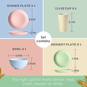 Teivio 16-Piece Kitchen Plastic Wheat Straw Dinnerware Set, Service for 4, Dinner Plates, Dessert Plate, Cereal Bowls, Cups, Unbreakable Plastic Outdoor Camping Dishes, Multicolor