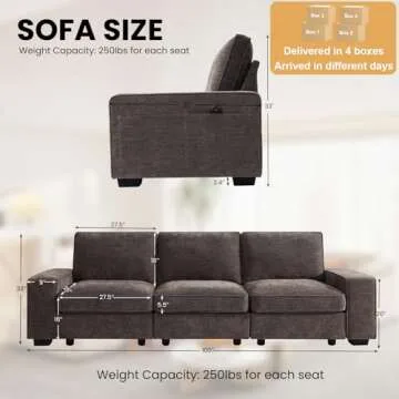 TEKAMON 100" Modular Sofa Couch with Seats Storage, Comfy 3-Seater Chenille Fabric Couch for Living Room, Office, Apart W/Deep Seat, USB Charging, Side Pockets, Couch with Removable Cover (Dark Grey)