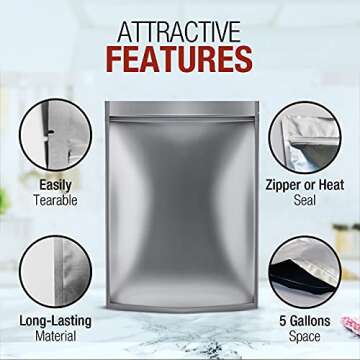 TekUnlimited - 10 Pack | 5 GALLON Mylar Bags w/ 15 (2000cc) Oxygen Absorbers (Individual) –10 mil Mylar Bags for Food Storage for Grains, Wheat, Rice, Dry Aging Bags for Meat - Long Term Food Storage