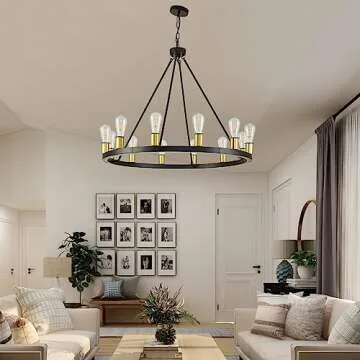 Show moreIlluminate your space with the stunning TELAFLY 12-Light Wagon Wheel Chandelier, a perfect blend of modern sophistication and farmhouse charm. Crafted with precision, this exquisite chandelier boasts a unique wagon wheel design, allowing it to be a striking centerpiece in any room. With a large diameter of 34.6 inches and a bold black and gold finish, it effortlessly enhances the aesthetic of your living room, dining room, kitchen, foyer, or bedroom while providing generous ambient lighting. Each of the twelve lights casts a warm glow, creating an inviting atmosphere for gatherings or quiet evenings at home.
