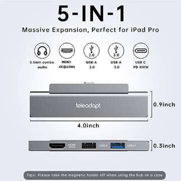 Show moreIntroducing the Teleadapt iPad Pro USB C Hub, a powerful 5-in-1 adapter designed specifically for your iPad Pro. This compact hub seamlessly integrates the functionality of multiple devices into one intelligent gadget, enhancing your iPad experience while allowing you to maximize productivity. With a 100W USB-C Power Delivery (PD) port, you can charge your device while using it, ensuring you always stay connected. The hub includes a stunning 4K HDMI port for high-definition video output, a versatile 3.5mm headphone jack, and dual USB ports with USB 2.0 and USB 3.0 capabilities, supporting fast data transfers and an immersive multimedia experience. Perfectly tailored for iPad Pro 2020, 2021, iPad Air 2022, and iPad Mini 6, this hub transforms the way you use your devices.