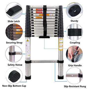Telescoping Ladder Extension Ladder 12FT Collapsible Ladder Telescopic Extendable Ladder, Stainless Steel Attic Ladder Rv Ladder Roof Ladder, Multi-Purpose Ladder for Household Daily, 330 Lb Capacity