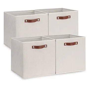 Temary Fabric Storage Cubes with Leather Handles - 4 Pack Baskets for Home Organization
