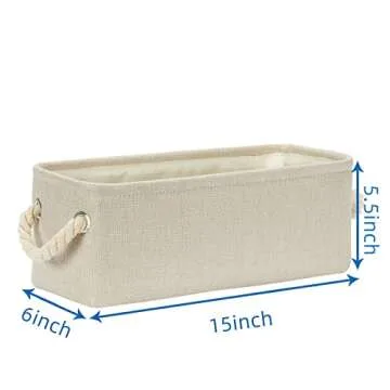 Show more Introducing the Temary Small Fabric Storage Baskets - your ultimate organizing solution! Expertly crafted with durable materials, these narrow rectangle baskets are designed to seamlessly integrate into your home decor while serving a practical function. Measuring at 15 inches long, 6 inches wide, and 5.5 inches high, they provide the perfect size for versatile storage. Whether you need to tidy up your bathroom, living room, or bedroom, these chic beige baskets will enhance your organizational efforts while adding a touch of style with their elegant rope handles.