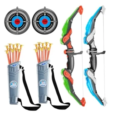 Show moreIntroducing the TEMI 2 Pack Set Kids Archery Bow Arrow Toy Set – an entertaining and educational outdoor experience designed for kids aged 3 to 12. This complete set includes everything your budding young archers need to embark on thrilling outdoor adventures! With two main bows, 20 suction cup arrows, two targets, and matching quivers, children can challenge their friends to practice their aim and improve their hand-eye coordination in a safe, fun way! The unique feature of LED lights adds an element of excitement, making it easy to track arrows in low-light conditions, perfect for night-time outdoor play.
