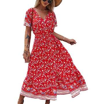 TEMOFON Women Bohemian Floral Dresses Summer V Neck Casual Flowy Split Maxi Dress Red M