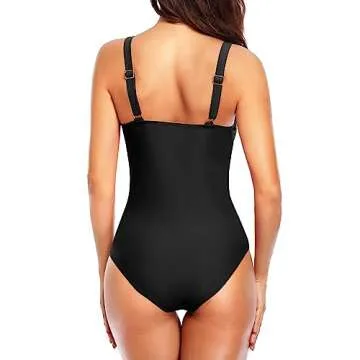 Tempt Me Women Black Ruched Slimming One Piece Swimsuits Tummy Control Vintage Bathing Suits M