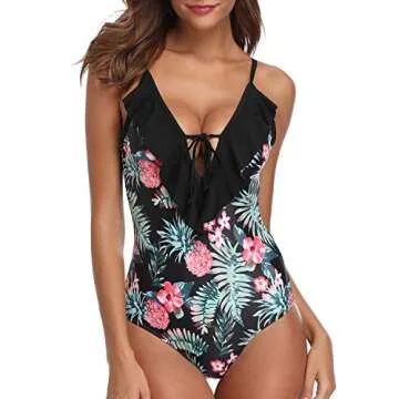 Tempt Me Women One Piece Deep V Plunge Keyhole Flounce Pineapple Floral Printed Strappy Monokini Swimsuit Black M